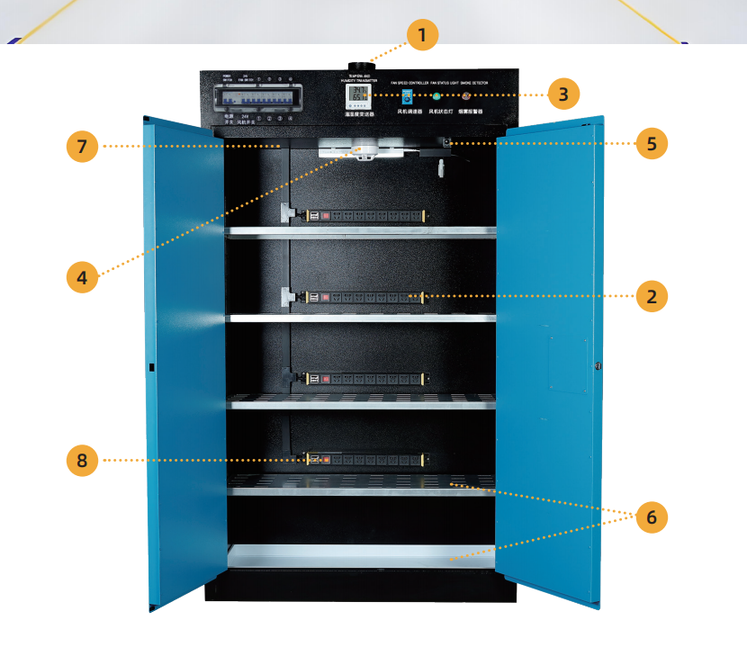 The temperature and humidity value of the cabinet can be monitored in real time under the power -on state. When the temperature and humidity exceed the limited value of the settings, the built -in beeurizer automatically alarm.
